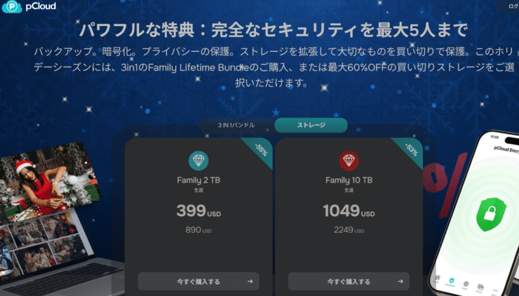 pCloudの2025年のクリスマス・セールは限定版 3in1 Family バンドル(5TB Family Lifetime + Encryption + pCloud Pass Family)を62%割引で購入できるセールです!