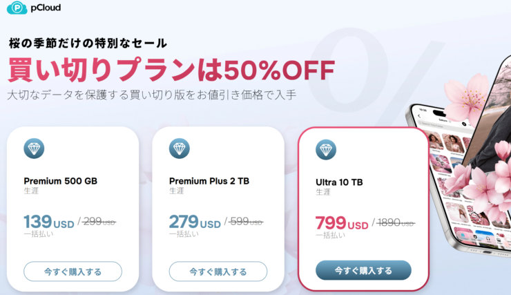 pCloudの桜満開セールは、pCloudライフタイムプランを半額以下で購入できるセールです!